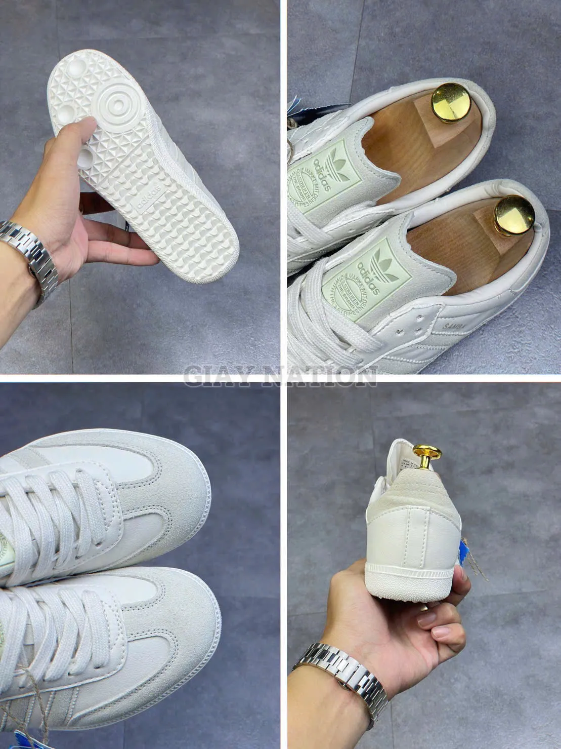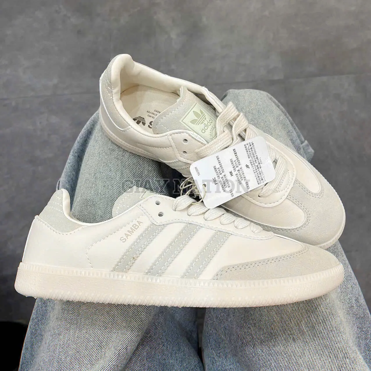 - Thiết kế: Giữ nguyên form dáng đặc trưng của dòng Samba với 3 sọc đặc trưng, mũi giày tròn và đế bằng. Gam màu kem tạo nên vẻ ngoài tinh tế, sang trọng.