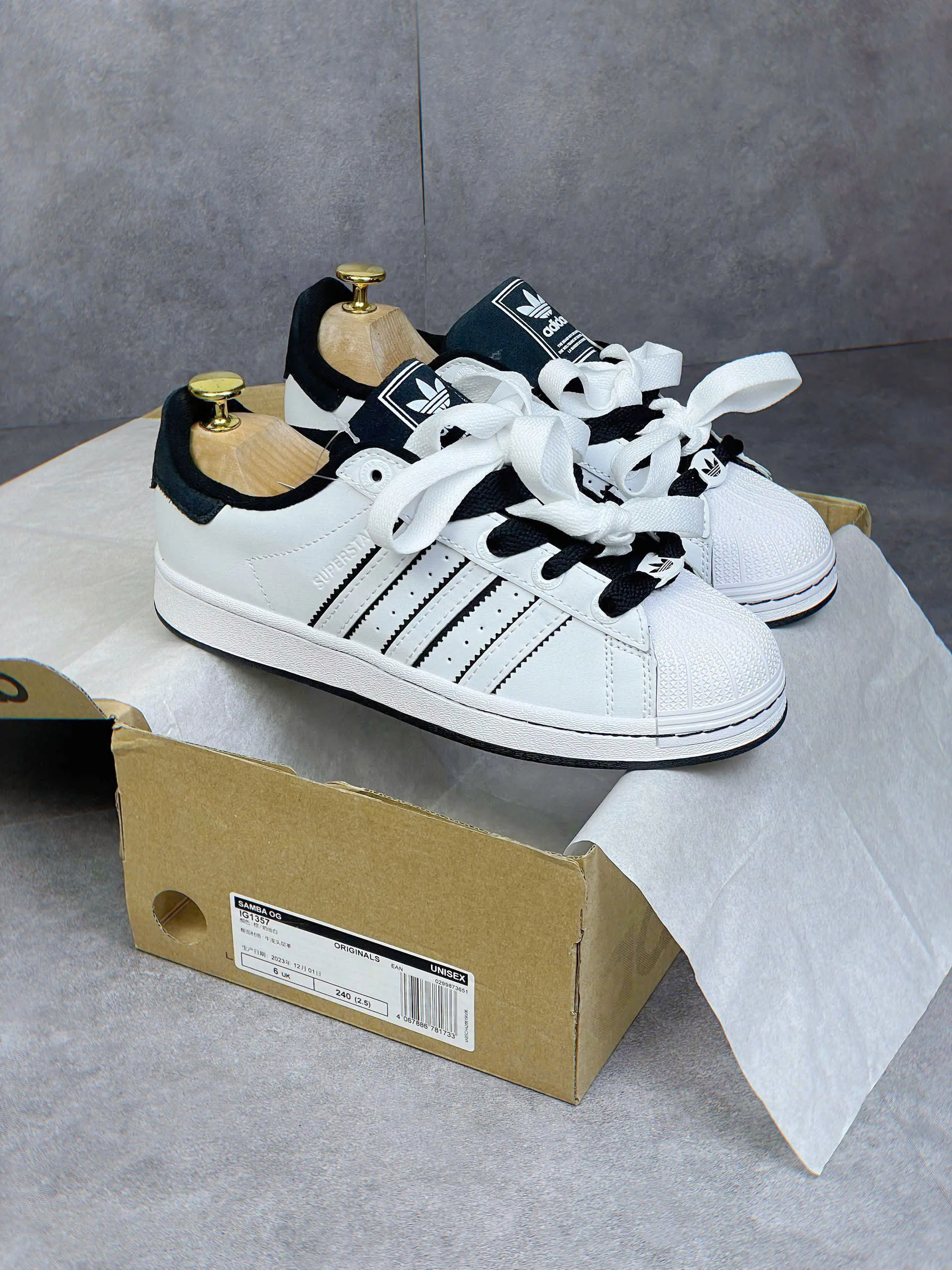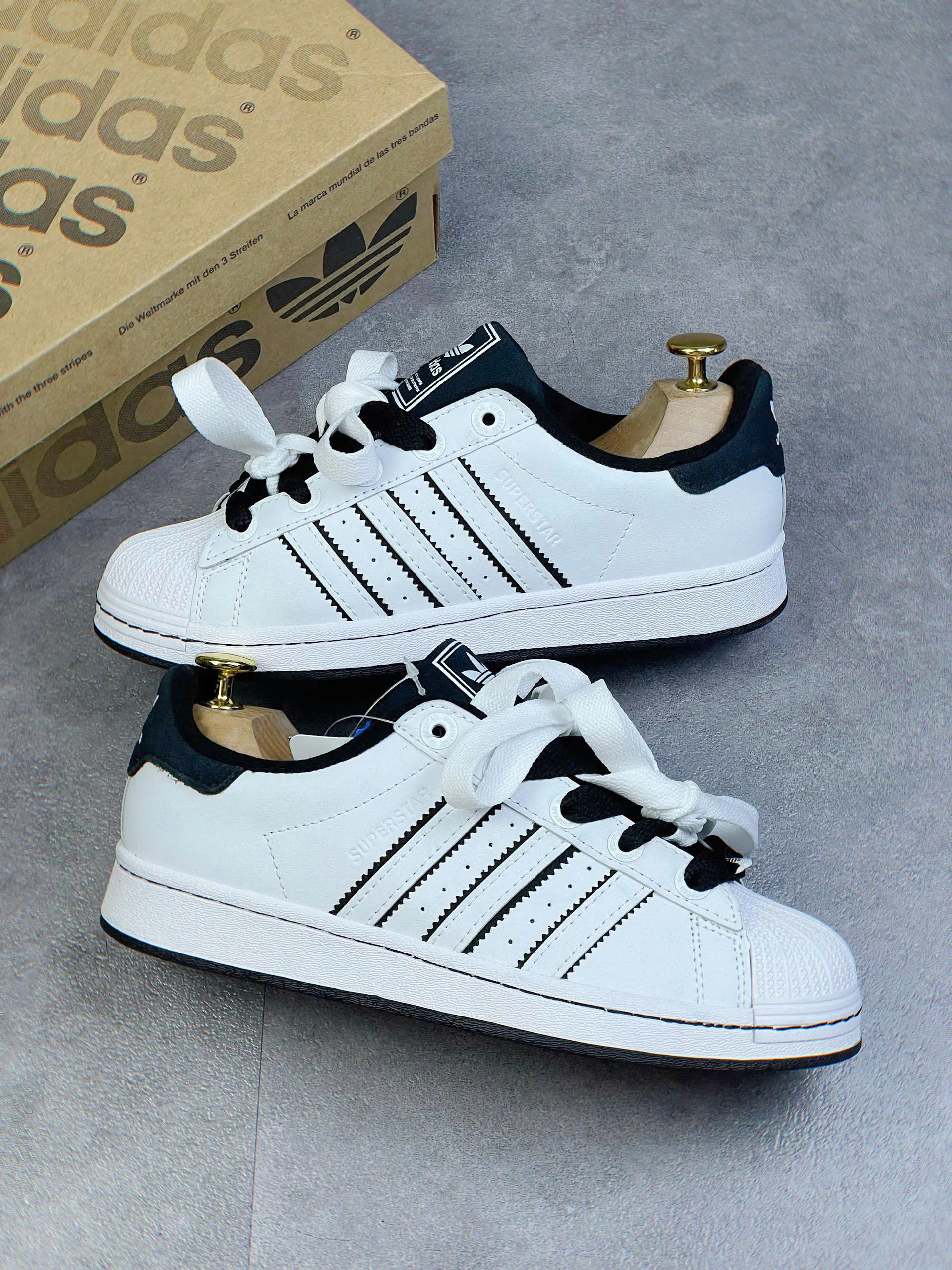 - Phối Màu OG Kinh Điển: Thân giày bằng da màu Trắng (White) cao cấp làm nền hoàn hảo cho Ba Sọc và chi tiết gót giày màu Đen (Core Black) tương phản – đây chính là phối màu biểu tượng nhất của dòng Superstar.
